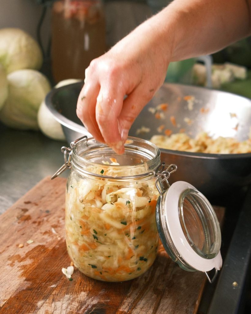 Try and experiment with adding different fruits and vegetables like carrot, fennel, leeks, apples, onion. If you use carrot and apple say in a sauerkraut, use under 25% of the total amount of veg because they change how fast the ferment will ferment and it will not last as long as a sauerkraut made with just cabbage would. Herbs can really flavour a sauerkraut nicely, like mint, oregano, thyme and ginger, chilli and garlic can really add some flavour. The fermentation process does mellow and create more complex flavours so it is worth experimenting and finding out what you find floats your boat. The fermentation process also changes over time so it is worth trying your ferments over time to see what you prefer.